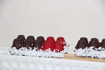 Ils ont peint en deux fois une boîte à oeufs : un côté rouge et un côté marron, j'ai protégé chaque côté par un papier afin qu'ils ne dépassent pas.