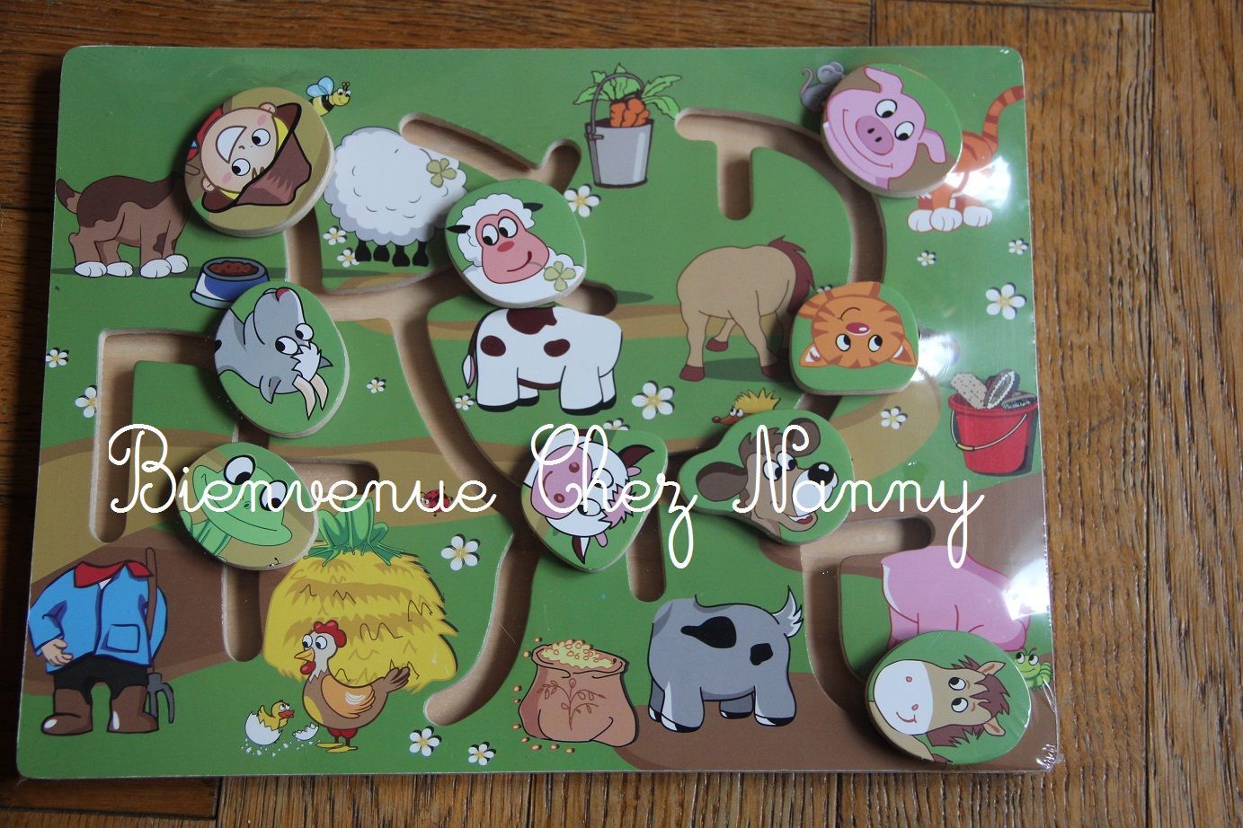 J'aime beaucoup les jeux en bois, alors je lui ai trouvé un puzzle labyrinthe où il faut déplacer les têtes des animaux de la ferme sur le bon corps.